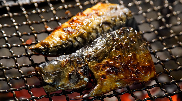 いろりの炭火で余分な脂は落とし、
